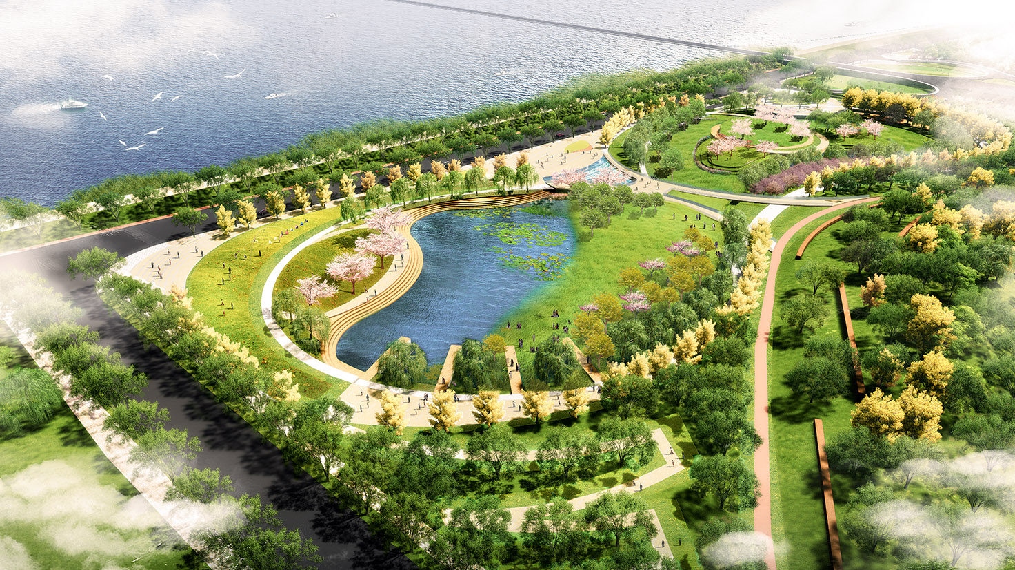 項目規(guī)模:全長約11.1公里,總用地面積約204.7公頃;其中規(guī)劃濱江路面積約52.9公頃,景觀面積約151.8公頃。