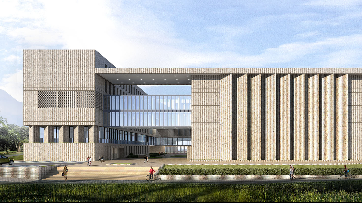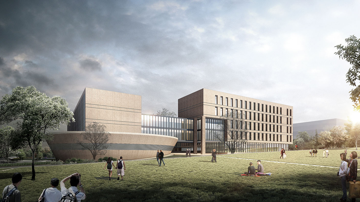 設計背景:本案遵循基地現(xiàn)有特性,合理利用原有地形高差進行設計,將南、北兩棟在高度上形成“北高南低”之勢以呼應地形的特性。充分利用臺階、坡道、連廊等灰空間將建筑空間融于自然環(huán)境中,使其建筑與自然環(huán)境共融,形成“山水校園”。 通過虛實穿插的庭院空間營造不同的空間關系,整體形成一種“既圍合又開放”的空間布局。這種空間布局既體現(xiàn)了學校各院系對內研究的嚴謹性,同時又利用開放空間滿足各院系之間交流與學習的需要。這種“既圍合又開放”的空間布局同時映襯著毛澤東同志虛懷若谷、海納百川的氣魄,體現(xiàn)的是一種各院系之間的團結精神。"
